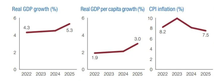 • L’augmentation des investissements publics dans les infrastructures améliore l’environnement des affaires, tandis que la forte demande pour les minéraux de Madagascar stimule les performances à l’exportation.