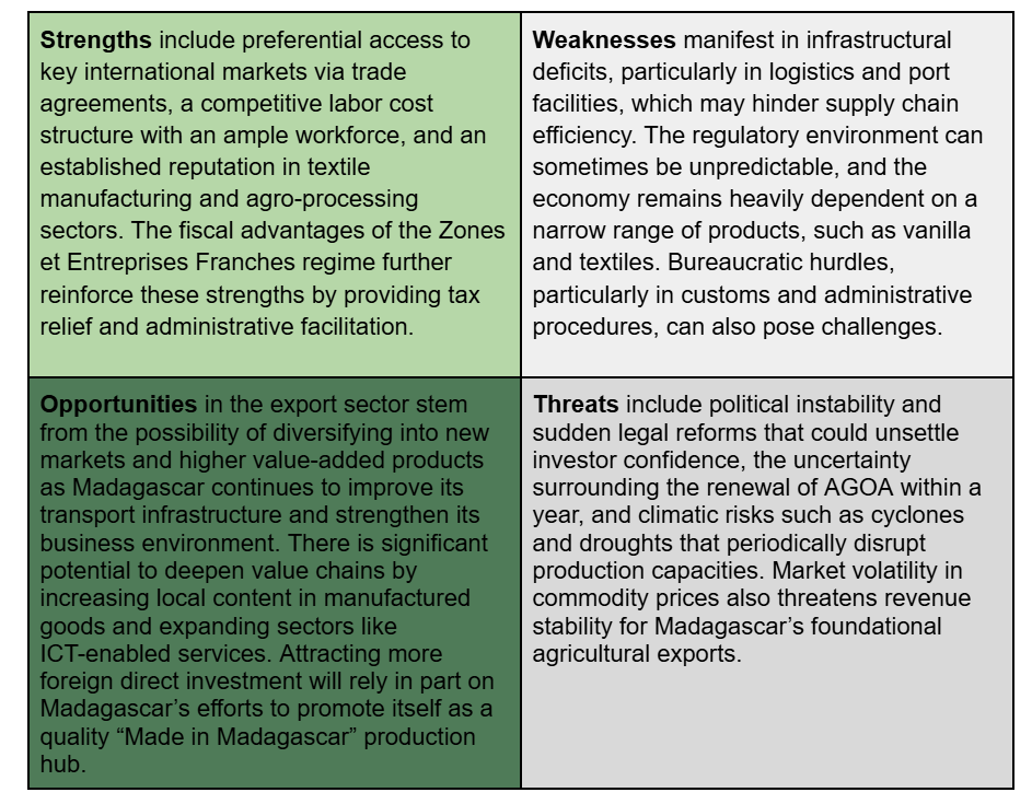 Conducting a SWOT (Strengths, Weaknesses, Opportunities, and Threats) analysis of Madagascar’s export industry reveals a range of factors shaping its current landscape and future prospects.